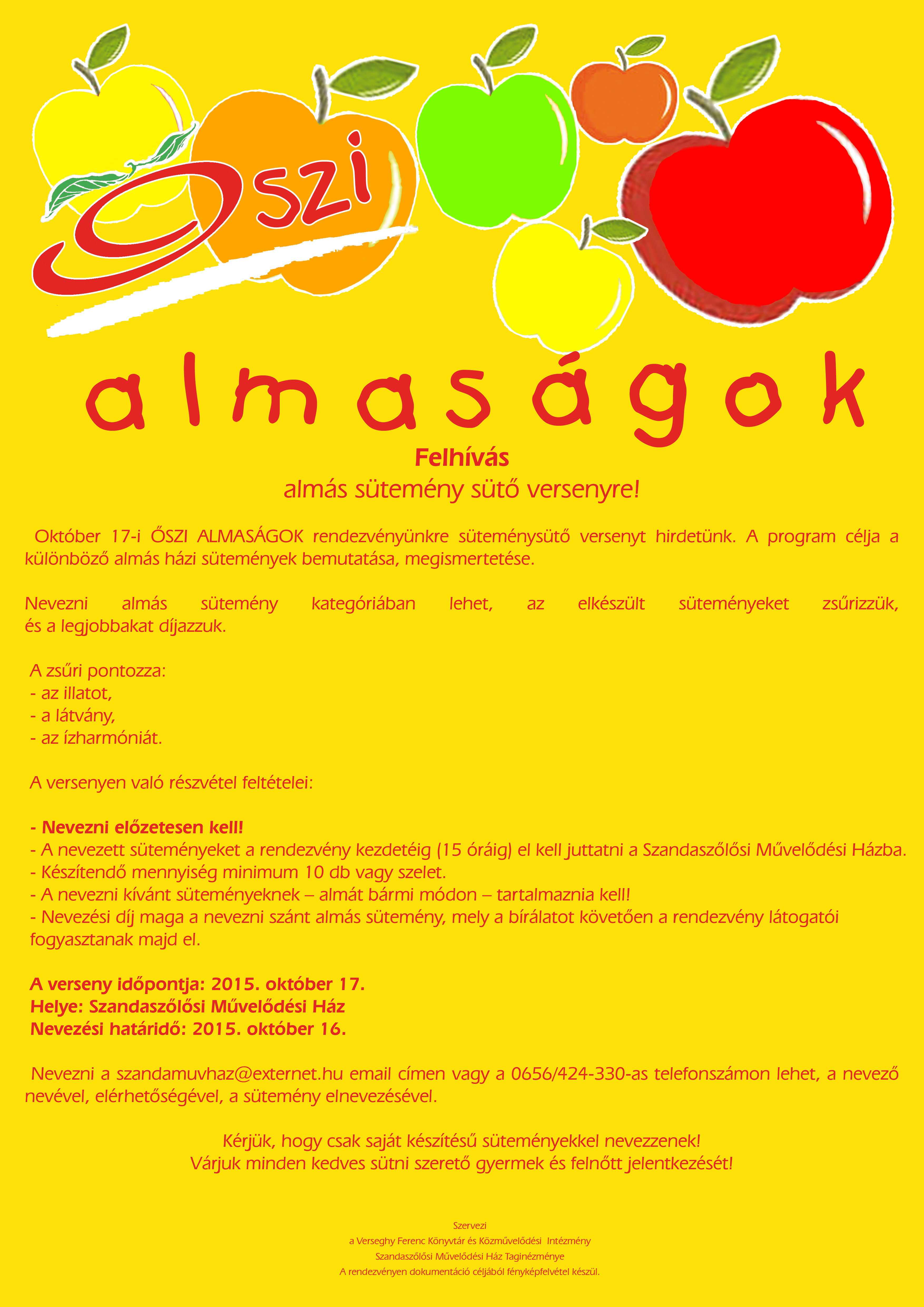 2015. október 17. 15.00 óra Őszi Almaságok. Minden, ami alma: jellegzetes almás finomságok, almadobáló verseny, almás játékok várják a rendezvény résztvevőit.